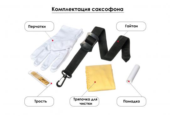 Комплектация Мундштук, лигатура, гайтан, перчатки, трость, помадка для корока, удобный и надежный футляр.