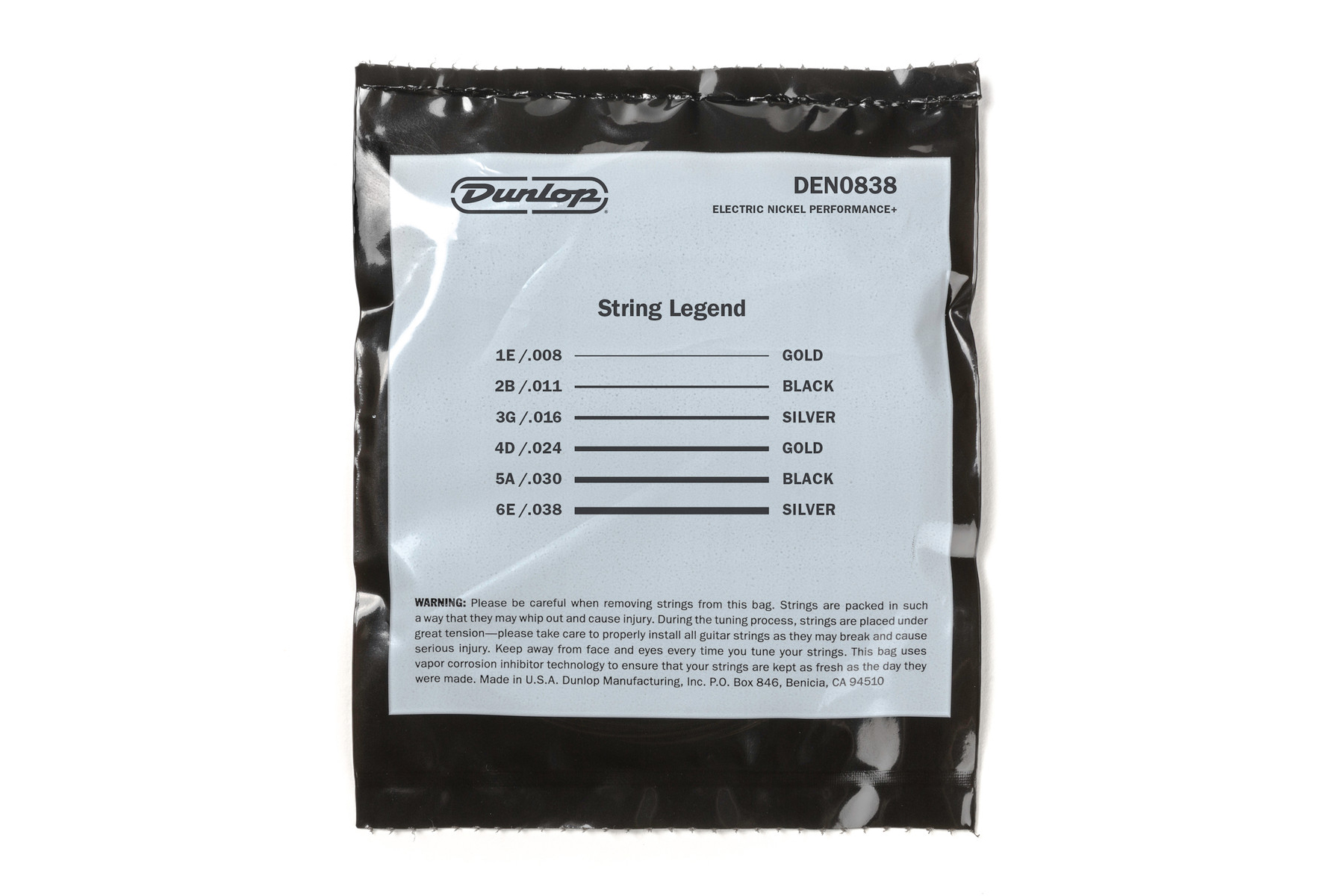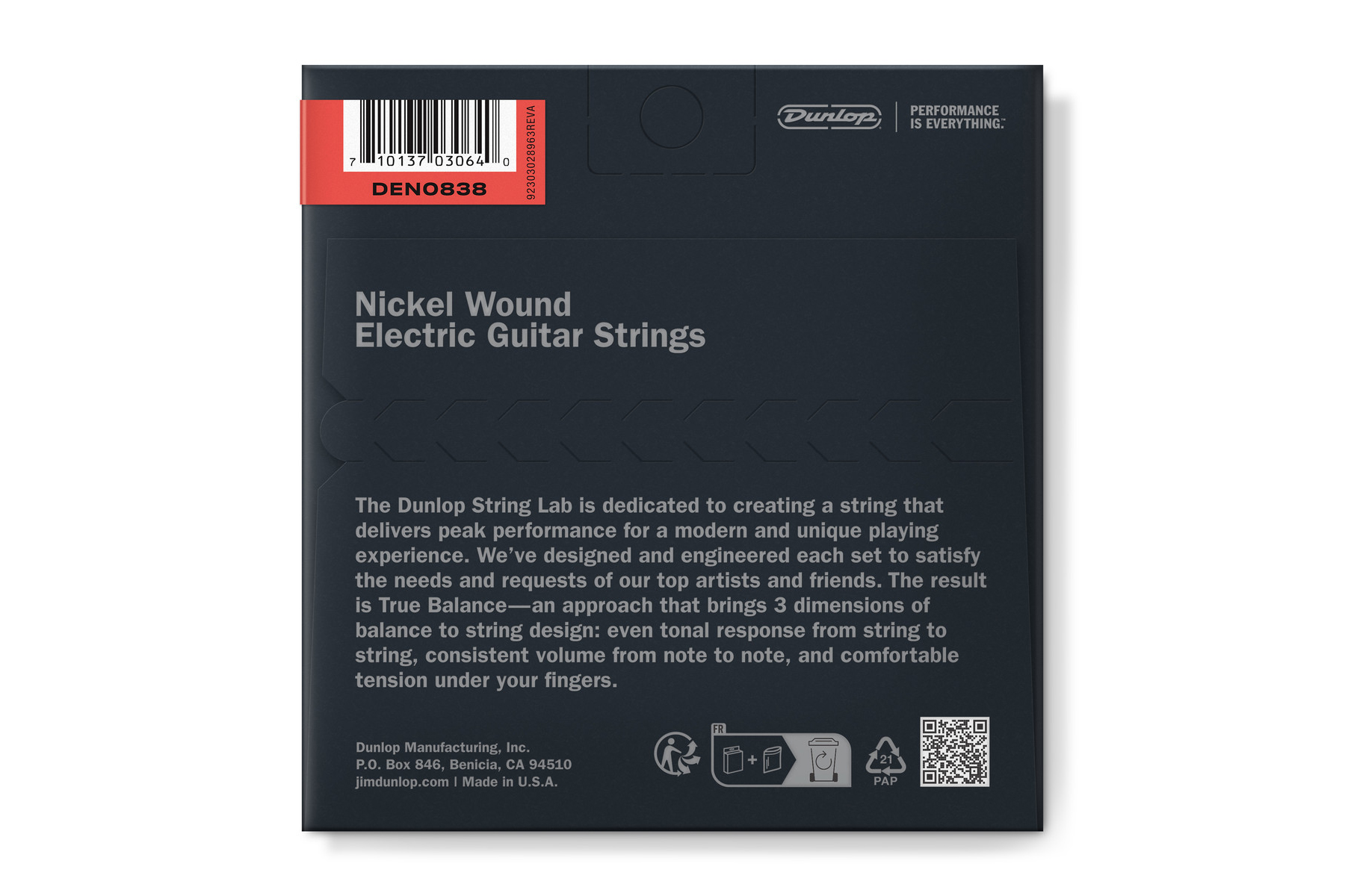 DUNLOP DEN0838 ELECTRIC EXTRA LIGHT 8. Уникальная комбинация яркого верха, агрессивной середины и хорошо сфокусированного низа придает струнам Dunlop для электрогитар свой неповторимый характер. Рецепт оптимального баланса и отзывчивости струн Dunlop формирует наборы, идеальные для динамичных лид-партий, при этом ноты в аккорде звучат сбалансированно и четко как на чистом звуке, так и на массивном дисторшн. Это мощное звучание живет в струнах с малым натяжением и мягким ощущением при игре. Они быстро усаживаются и долго не теряют своих свойств.