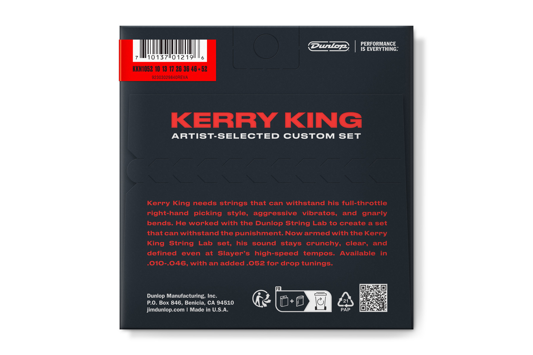 DUNLOP KKN1052 KFK ELECTRIC MEDIUM (10-52). Керри Кинг (Kerry King) — неоспоримый крестный отец треш метала — один из наиболее значимых гитаристов современности. Когда Керри понадобились более надежные и “живучие” струны, способные выдержать его натиск, он обратился к своим друзьям из Dunlop Strings. Теперь, вооруженное струнами “Kerry King Icon Series”, звучание Керри остается жестким и разборчивым даже с самым ураганным темпом Slayer. Набор “Kerry King Icon Series” изготавливается из высококлассной никелированной стали в размере .010-.046. В наборе также присутствует дополнительная струна .052 для пониженных строев.