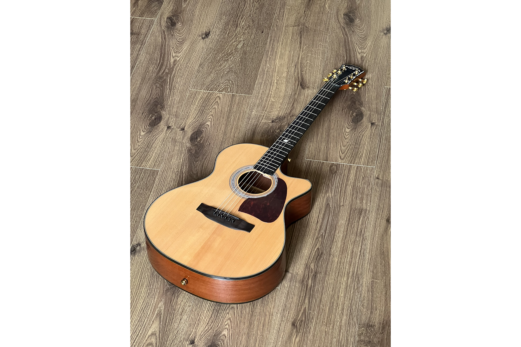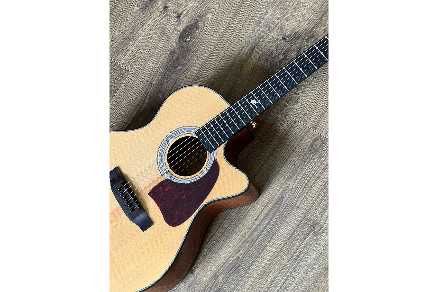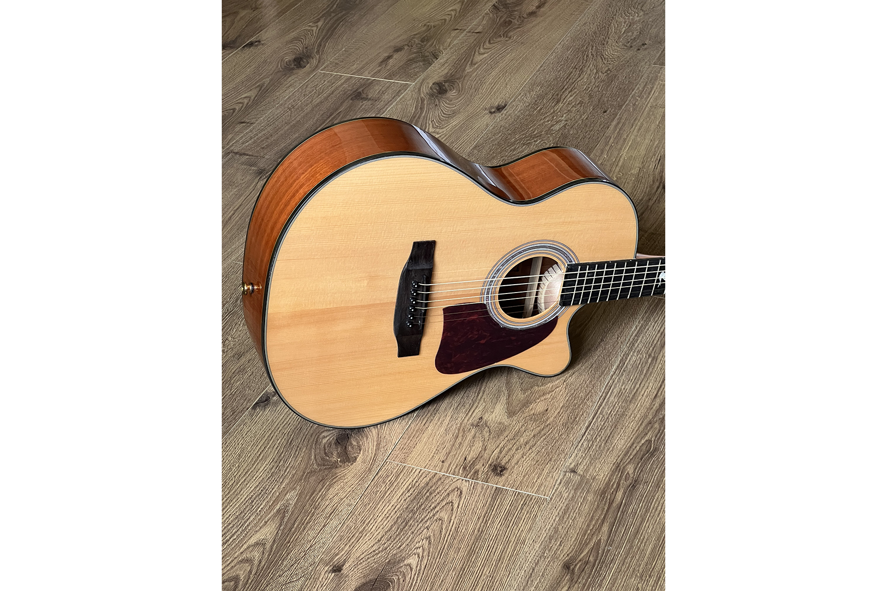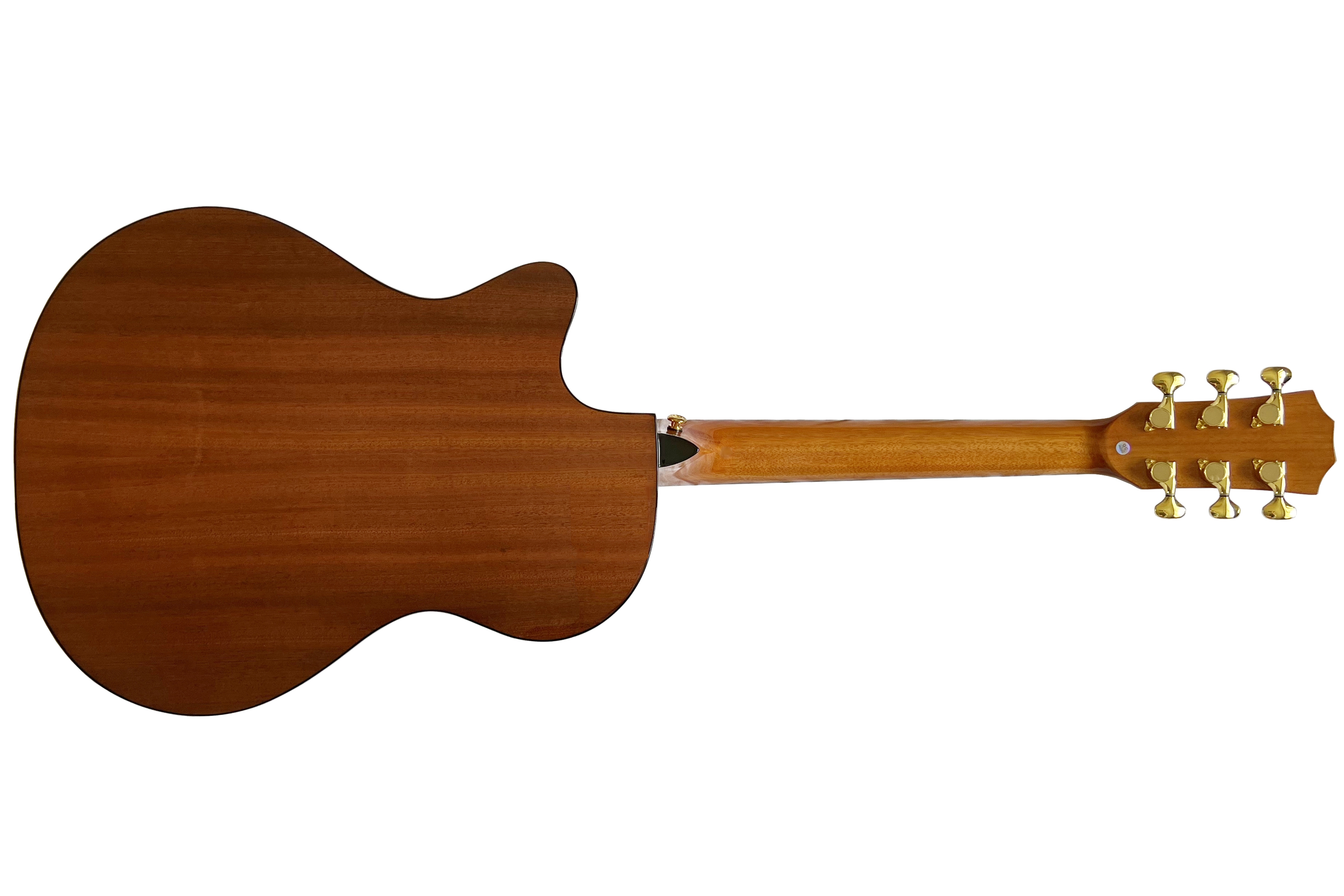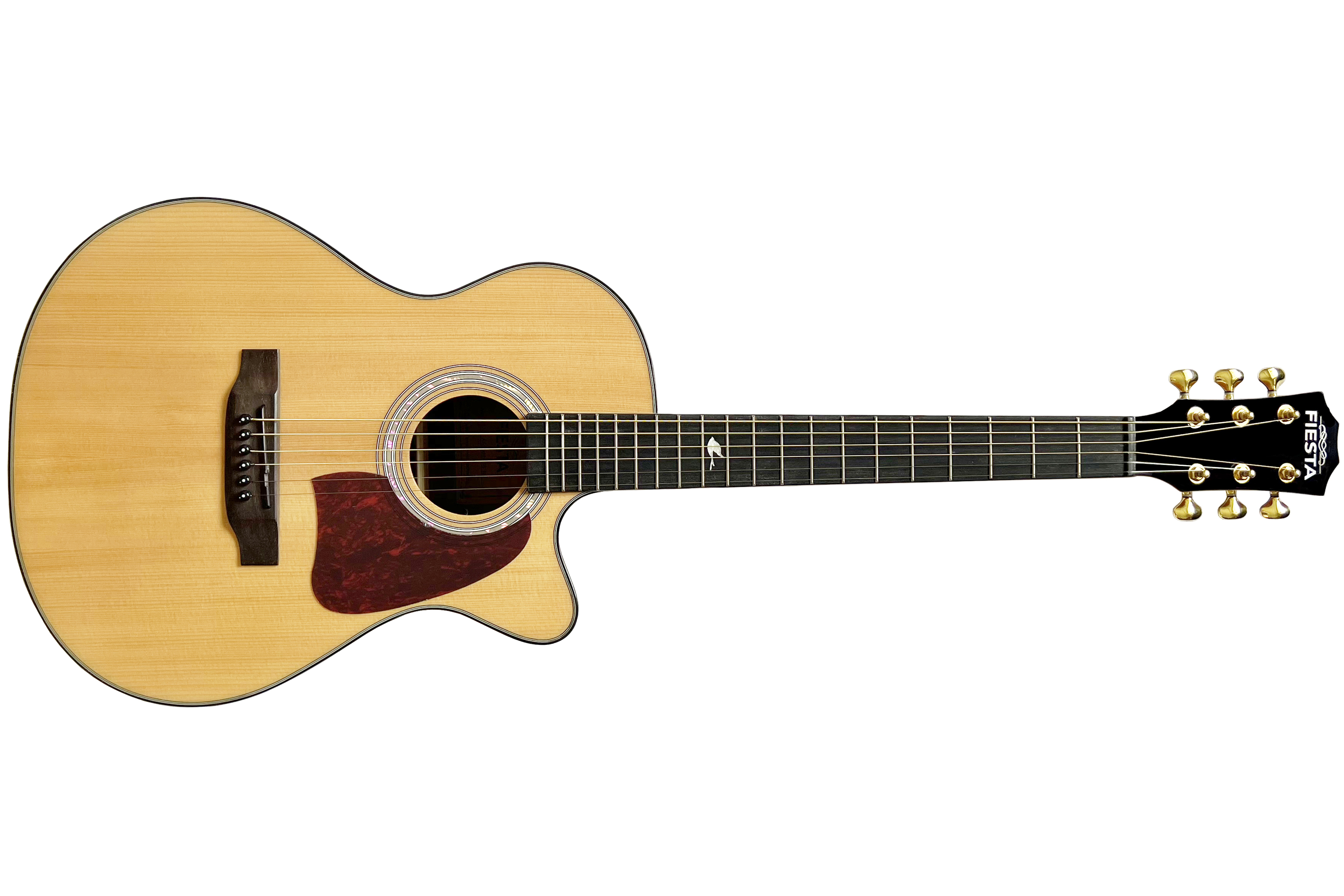Fiesta KANTA 38" Natural. Дредноут з вирізом 38 дюйм (зменшений корпус). Верхня дека: цільна ялина. Нижня дека: червоне дерево. Обичайка: червоне дерево. Гриф: червоне дерево. Зверніть увагу що ширина верхнього поріжка більша ніж у звичайних інструментів - 46 мм. Інкрустація: у вигляді птаха. Розетка: перламутова вставка. Брідж: палісандр. Механіка: колки Die cast позолочені та гудзики. Струни .012-.053. Колір: натуральний глянець. Кількість ладів 20. Комплектація: гітара, анкерний ключ.