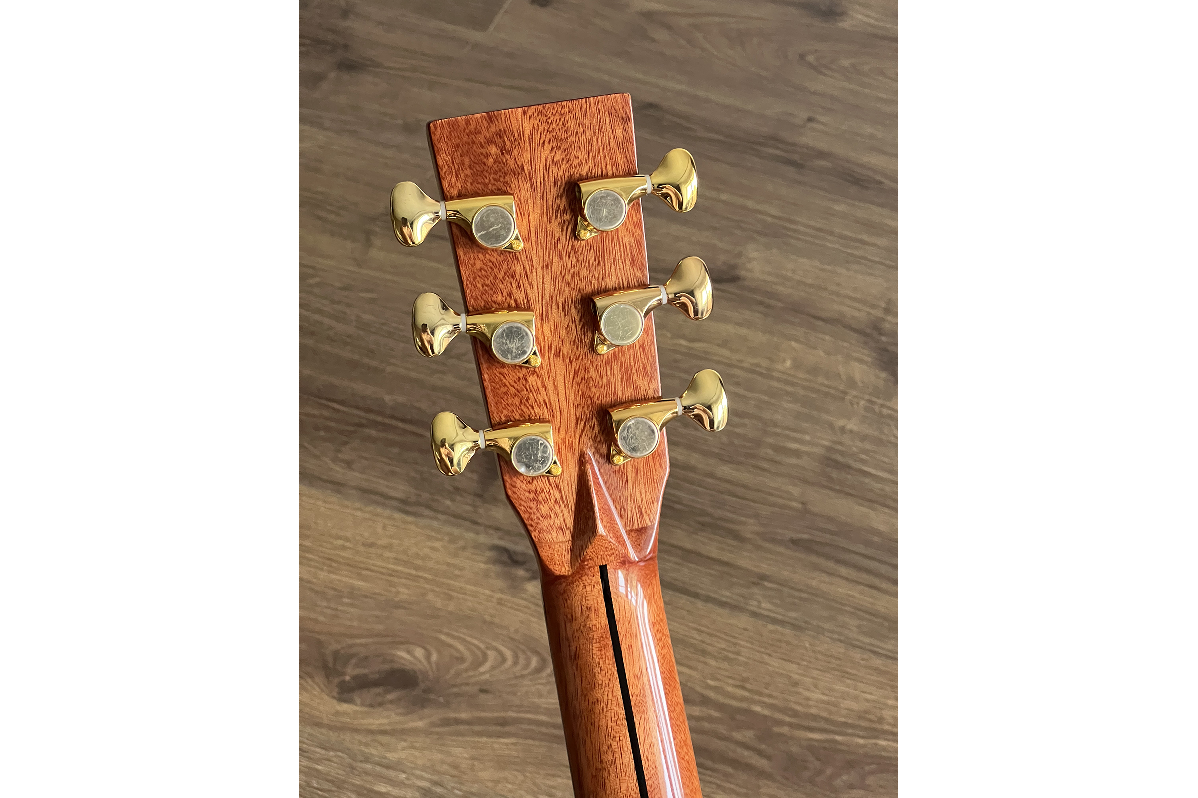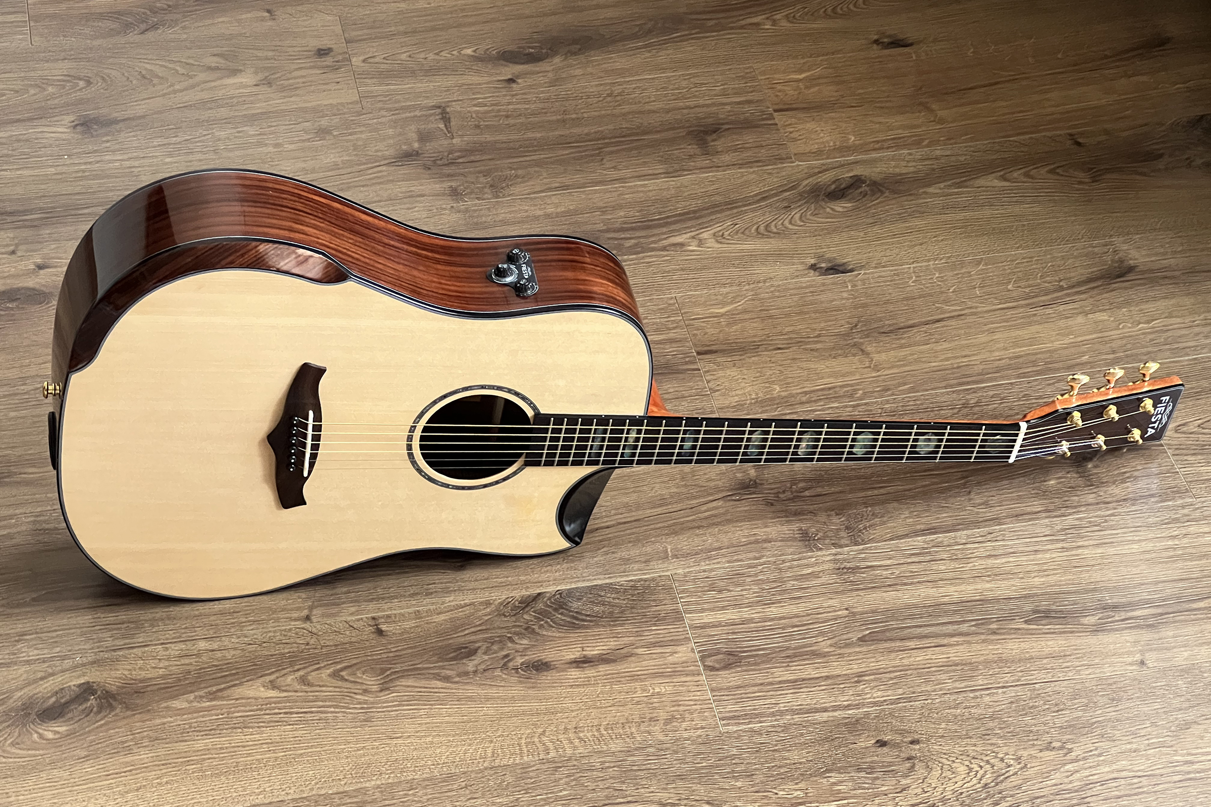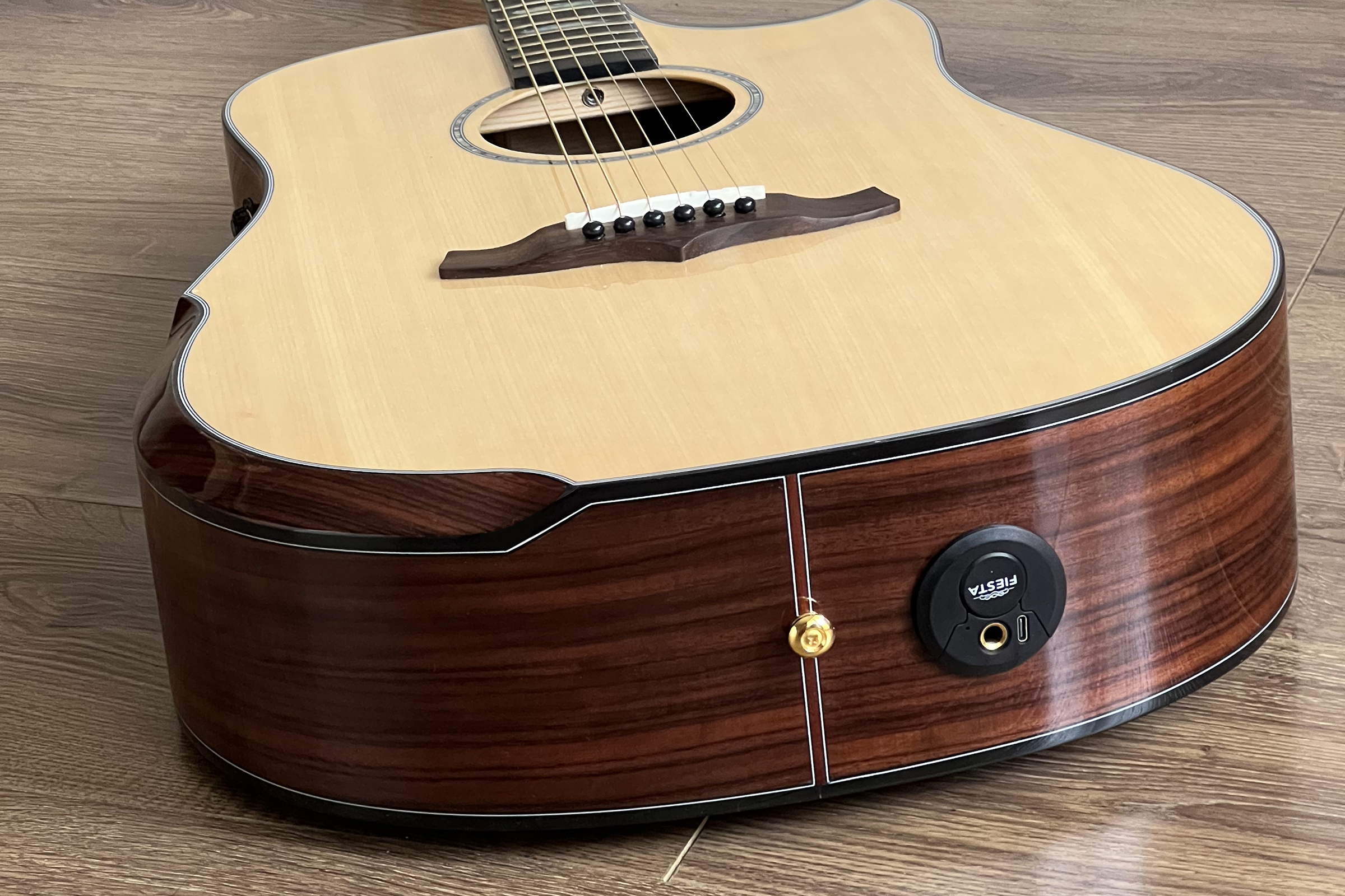 Трансакустична гітара дредноут. Активний звуконімач з ефектами CHORUS/DELAY/REVERB та вбудований BLUETOOTH приймач, ручка VOLUME POWER яка не тільки регулює загальну гучність, а також вмикає та вимикає інструмент. Верхня дека: ялина. Нижня дека: палісандр. Обичайка: палісандр. Гриф: червоне дерево. Інкрустація: у вигляді вставок наи грифі (перламут). Кілки: T-Style закритого типу позолочені. Гітара має гудзики для ременя. Розетка: перламутова вставка. Окантовка: перламутова вставка. Брідж: палісандр. Струни Alice 432. Колір: натуральний глянець. Мензура 648 мм. Кількість ладів 20. Додатково виріз Half cutaway. Доданий сріз під праву руку - Armrest. Комплектація: гітара, анкерний ключ, акумулятор та підзарядний пристрій.